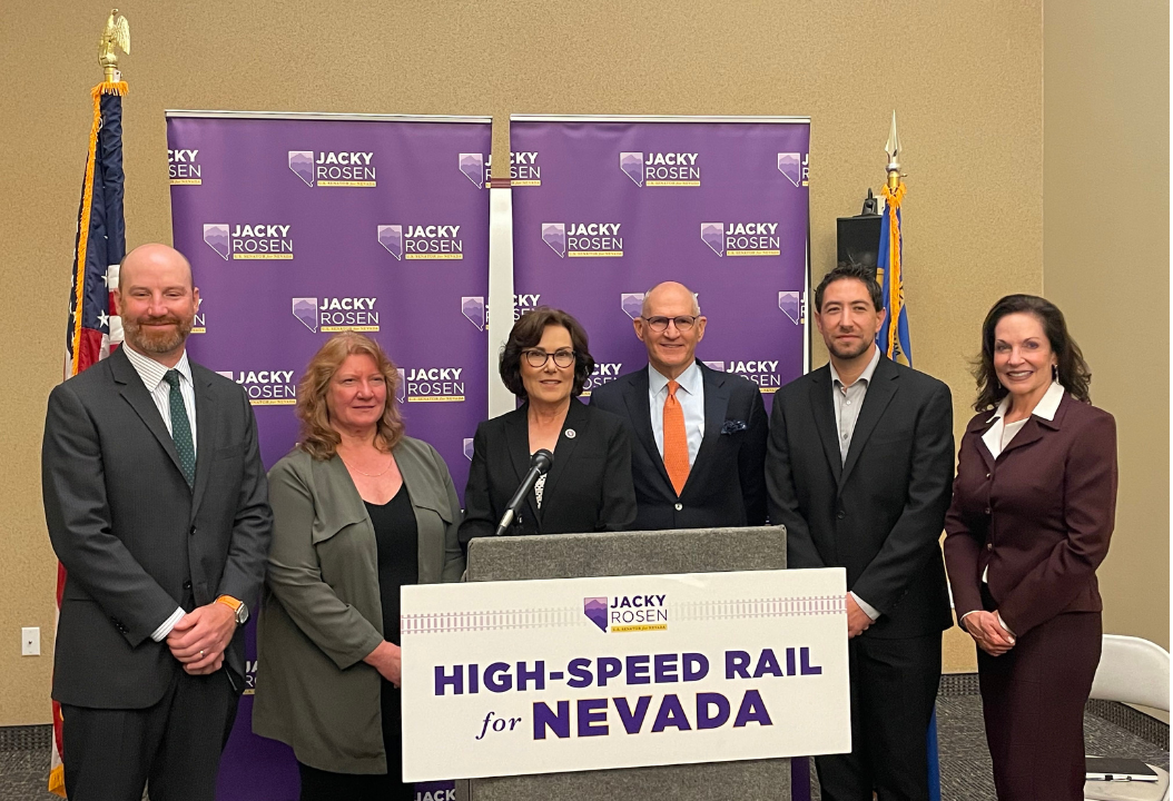 Yesterday, U.S. Senator Jacky Rosen (D-NV) held a press conference to call on the U.S. Department of Transportation (USDOT) to fund Nevada’s application, seeking $3.75 billion in federal funding to construct the Brightline West’s 218-mile high-speed rail project. The project will connect Nevada and Southern California through planned stations in Las Vegas and San Bernardino County, with connectivity into Los Angeles County through Metrolink.